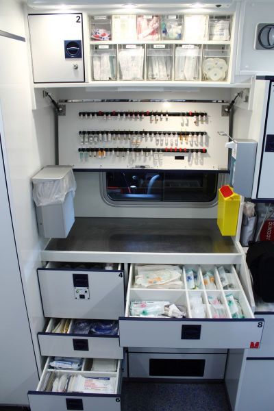 Oben: Klappkästen mit Verbrauchsmaterial & Medikamentenfach (abschließbar)